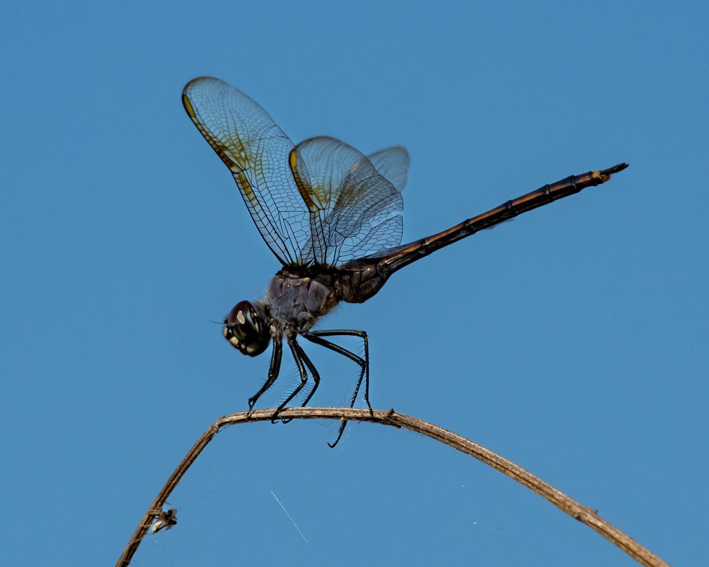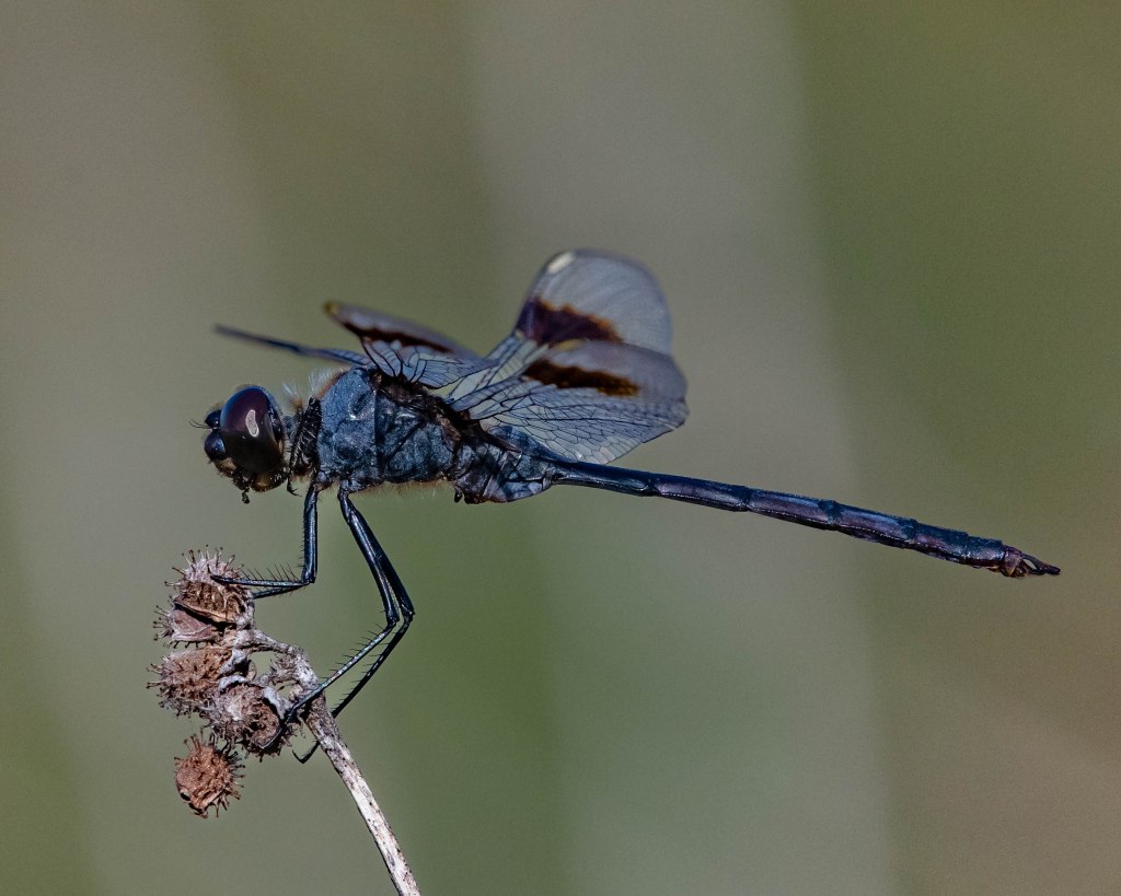 Another of our very common dragons is the Four-spotted Pennant (Brachymesia gravida), They tend to perch horizontally atop taller plants, especially on dried stems, and on fence wires.
