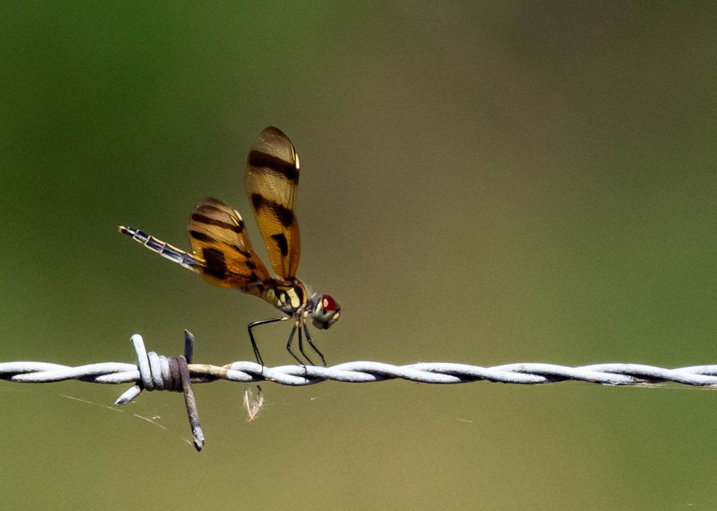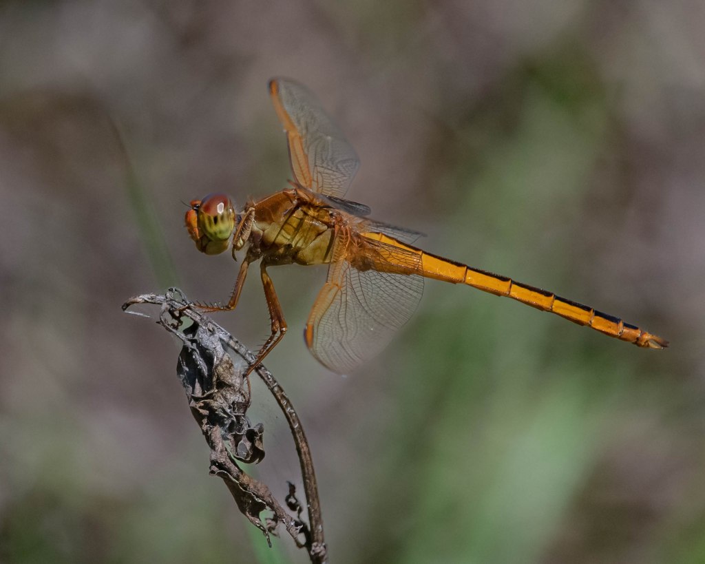 Beauty can often be found in small packages. One of the smallest dragonflies in North America, the Eastern Amberwing (Perithemis tenera), is a prime example. They fly with their legs dangling beneath in the hope a hungry predator will mistake them for a wasp and decide to leave them alone.