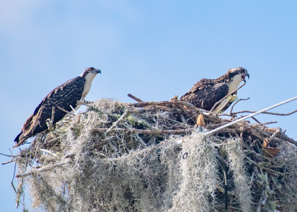 Junior admires Mom’s tenacity as the adult Osprey screeches at a potential intruder. Soon, the youngster will be screeching on his own.