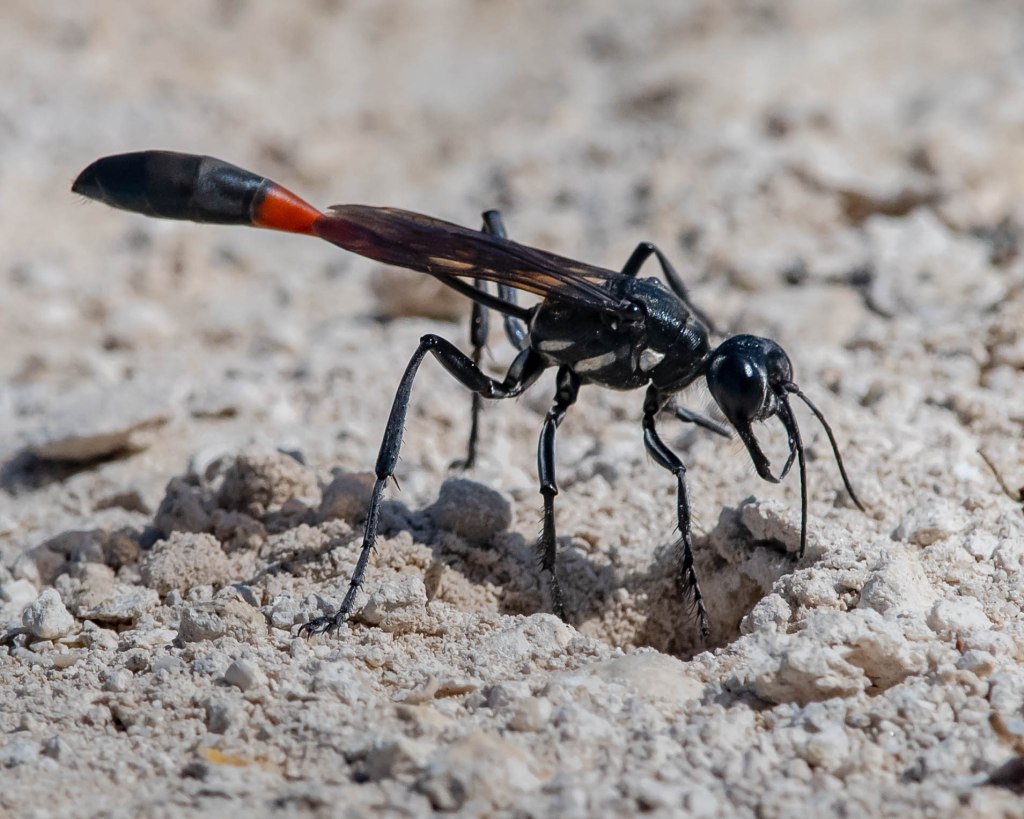 Common Thread-waisted Wasps (Ammophila procera) dig a hole in the ground in which they will deposit a food source, such as a caterpillar, lay eggs, cover the hole – lather, rinse, repeat.