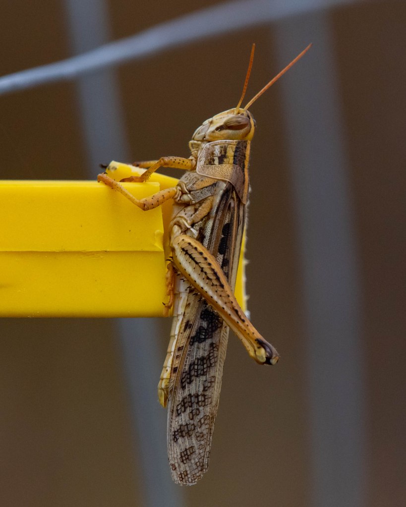 Walking near any grassy area at this time of year will flush good numbers of yellow-winged birds from under foot. Bird grasshoppers, that is. The American Bird Grasshopper (Schistocerca americana) is abundant as well as pretty attractive.