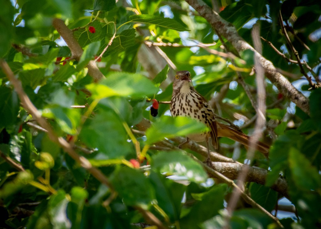 Sitting on a shady branch surrounded by juicy mulberries doesn’t sound like a bad way to spend a warm day. This Brown Thrasher, however, does not appear to be in a sharing mood!