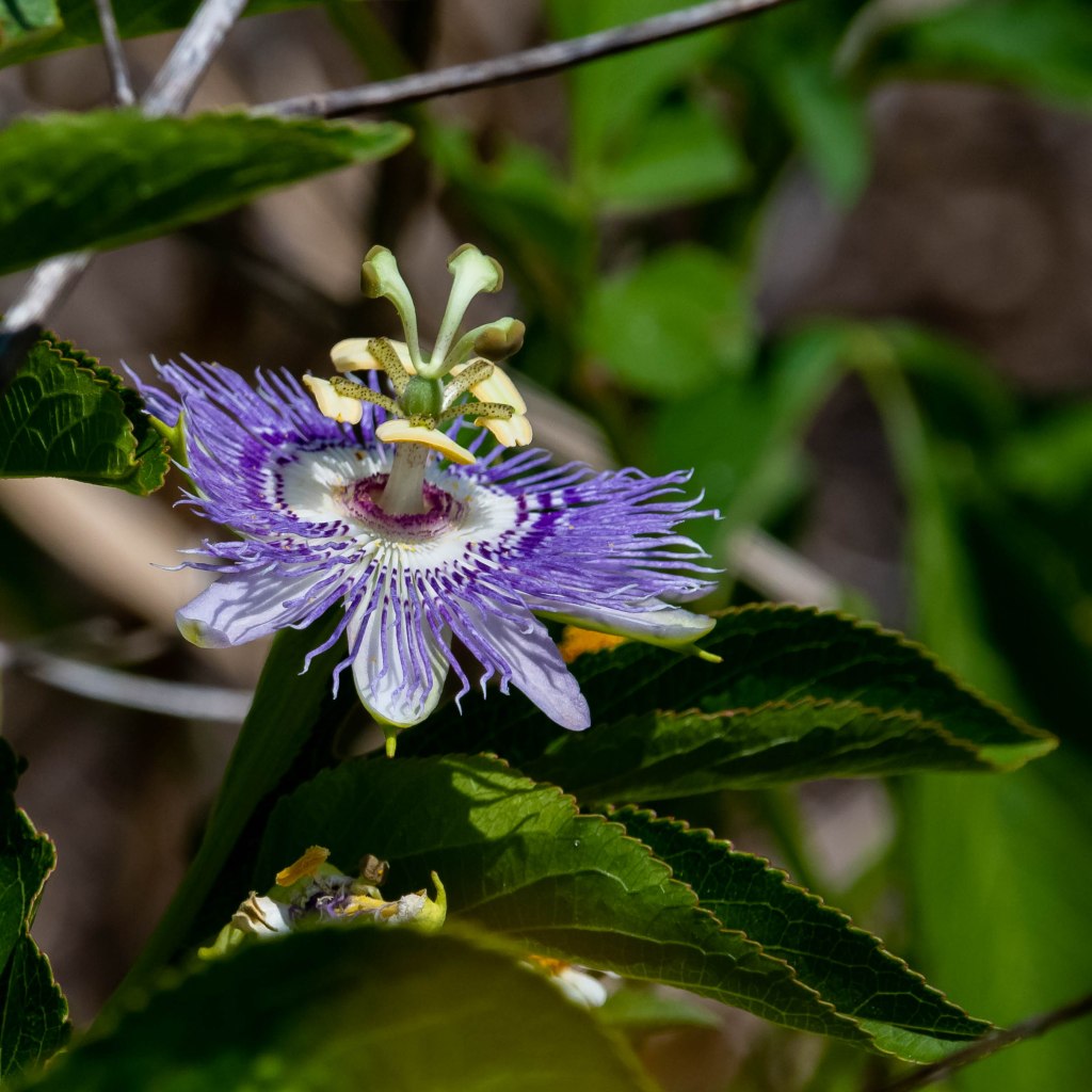Lush foliage, pale green fruit and an alien-looking but fabulous flower describes the Purple Passionflower (Passiflora incarnata). They seem to be blooming all around us at present.