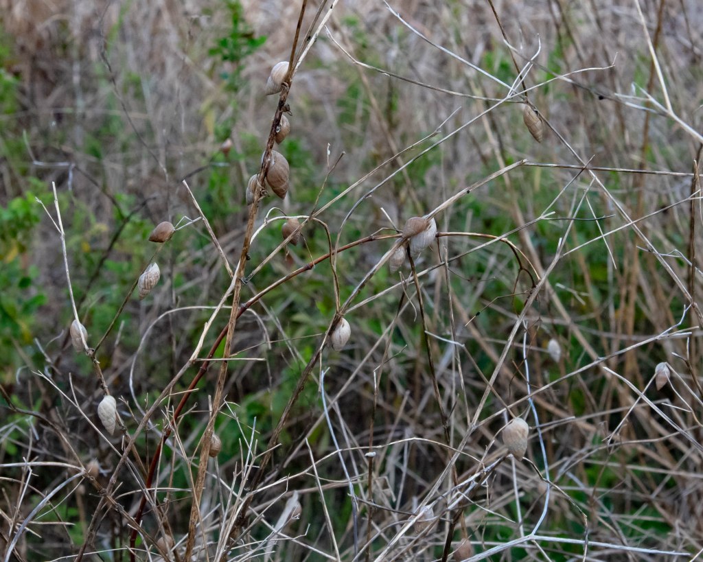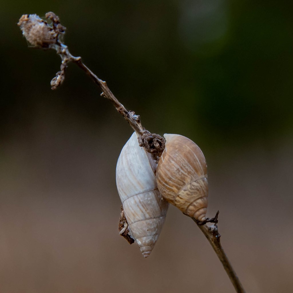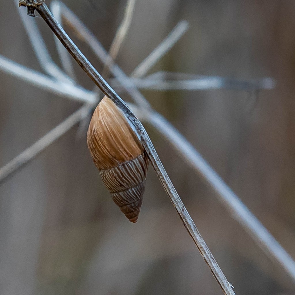 We think these are Rosy Wolfsnails (Euglandina rosea) but would appreciate confirmation or correction. They were present on many dried weed stems as well as metal fence posts. My understanding is once they hatch from just below the soil, they climb the first available thing to look for food, which can be lichens, moss, slugs or other snails.