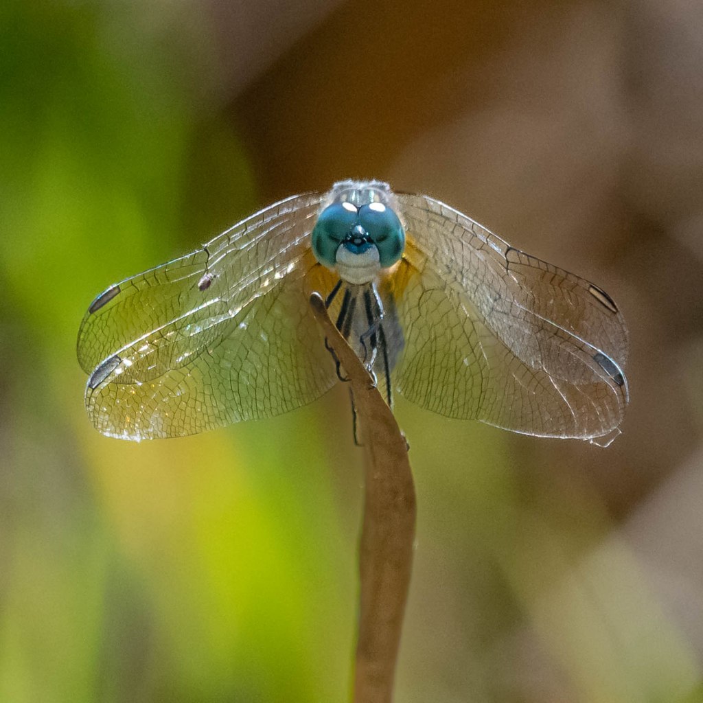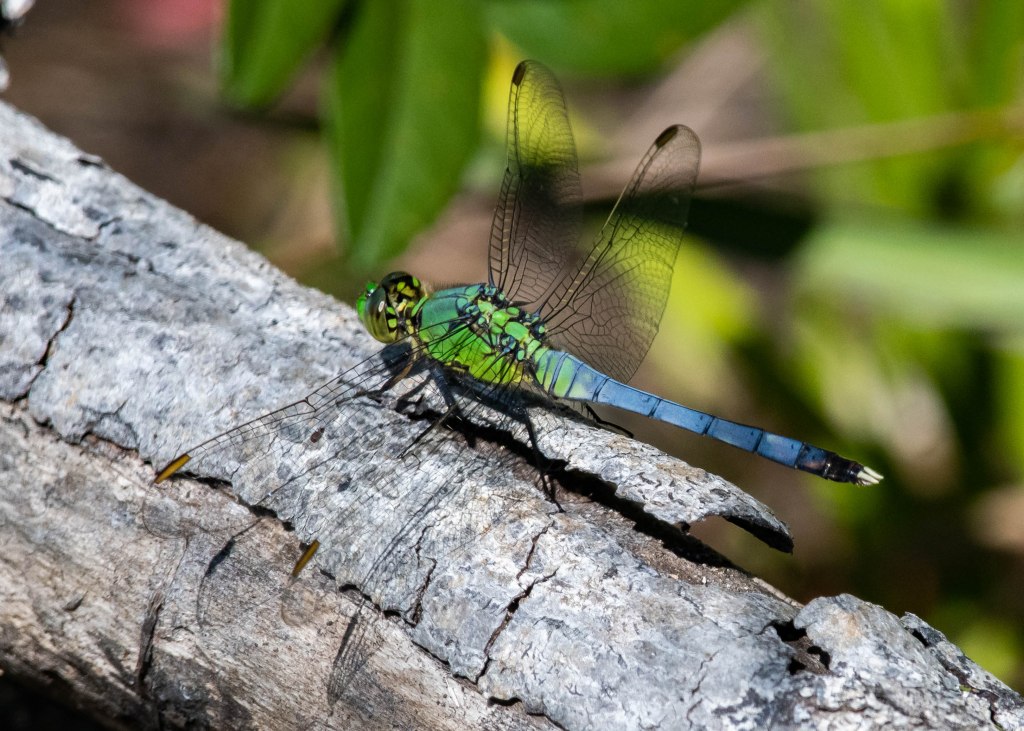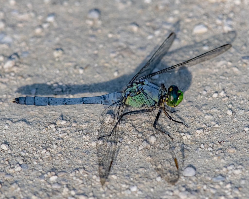 Just as the season is in transition, so is this immature male Eastern Pondhawk (Erythemis simplicicollis). Beginning as a copy of the all-green female, he gradually changes to the powder-blue of an adult male.