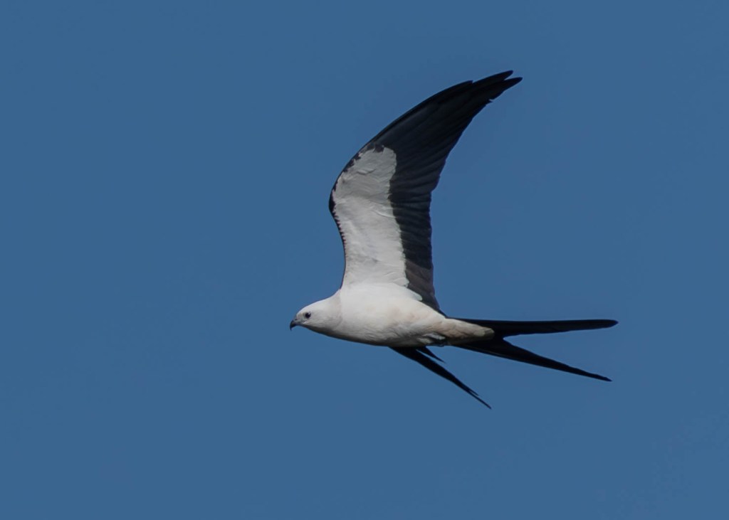 A trio of sleek Swallow-tailed Kites appeared above the cypress trees on the bank of the lake. Gini and I were enjoying a mid-morning brunch of fresh tangerines and granola bars and were content to sit back and enjoy the show. Long tails acted as rudders and the pointed wings hardly moved as they glided effortlessly just above the tree tops. Having spent the winter in South America, these raptors will soon select a tall tree near water and construct a nest. Lizards, snakes and flying insects provide the protein necessary for them to breed.