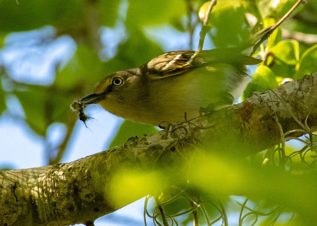 One of our year-round residents is the White-eyed Vireo. In the Spring, time is divided between constantly singing from the underbrush to impress females and searching for food, such as a delicious Tussock Moth (Orgyia spp.) larva.