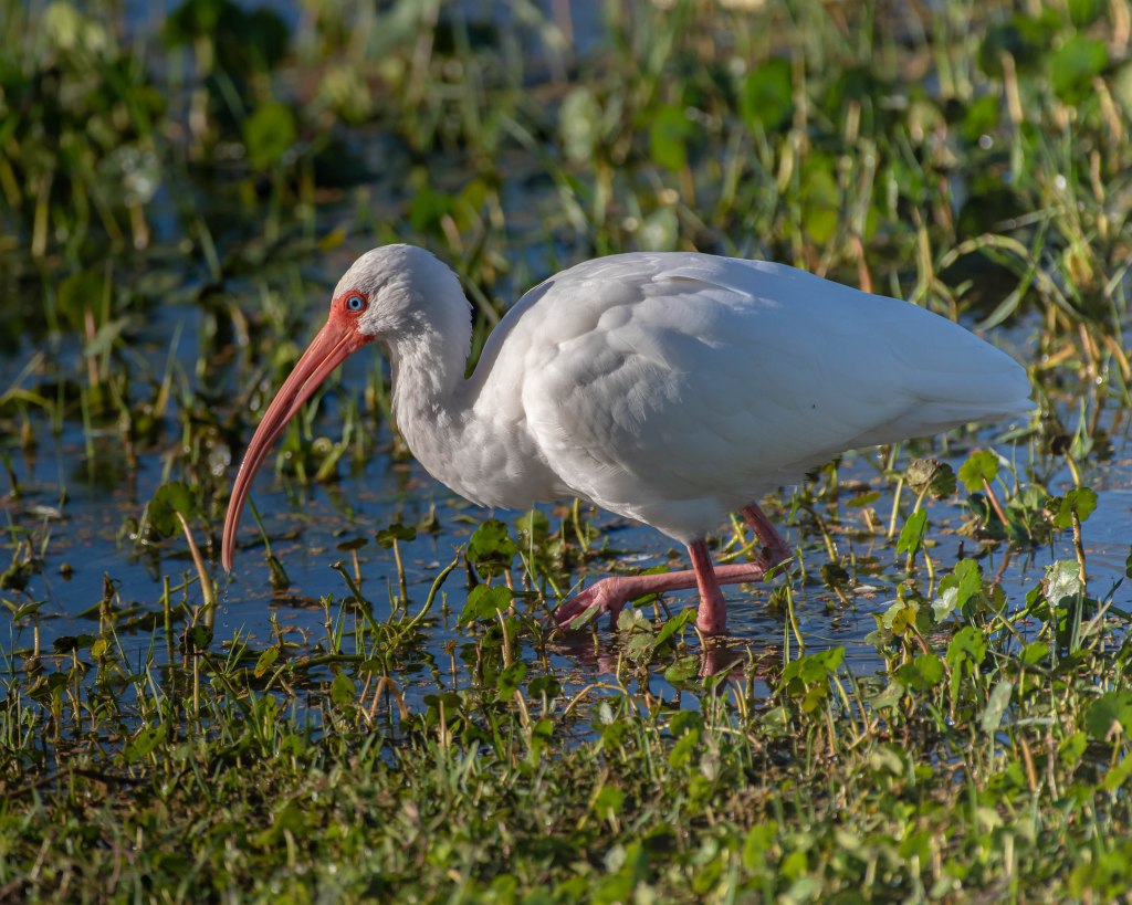 As breeding season progresses, the red legs and bills of the White Ibis will become more intense. Those blue eyes match the sky all year long.