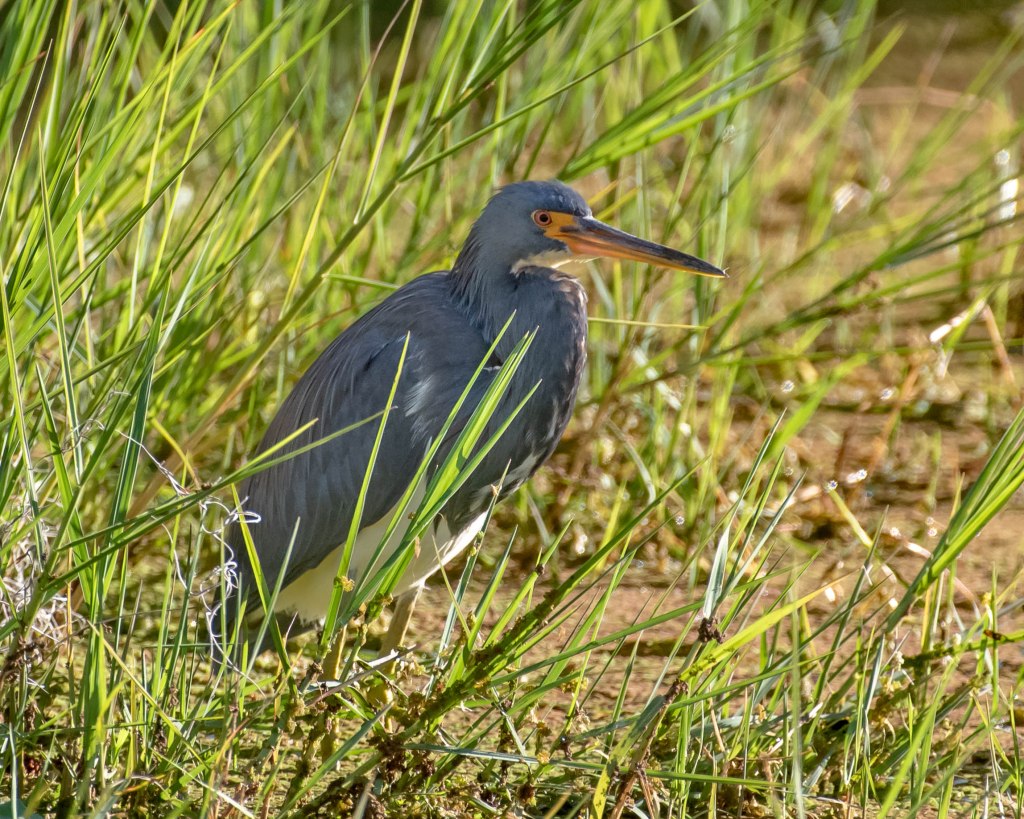 Tricolored Herons are sort of the behavioral opposites of their larger cousins, Great Blue Herons. The latter appears almost stately as it slowly moves through shallow water stalking its prey. The rambunctious Tricolored Heron is more a rapid-fire hunter and seems to almost never hold still as it dances and lunges in the shallow water.