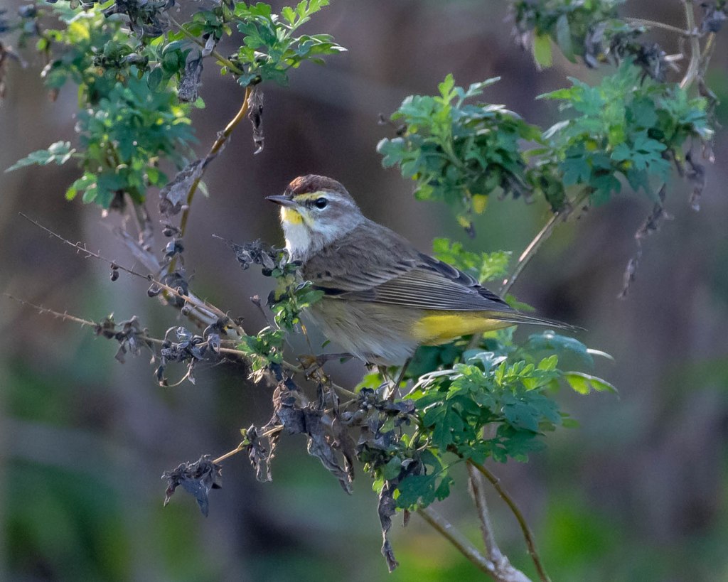One of our most abundant winter migrant song birds, Palm Warblers, are divided into two sub-species. The “western” version has a mostly pale belly while that of the “eastern” population has a fairly bright yellow belly. Both sub-species can appear pale overall during non-breeding season. They breed mostly in Canada and the dividing line for identification appears to be east or west of Hudson Bay. The best feature for identifying these little bundles is their nearly constantly pumping tails. Pictured is a “western” Palm Warbler in breeding plumage.