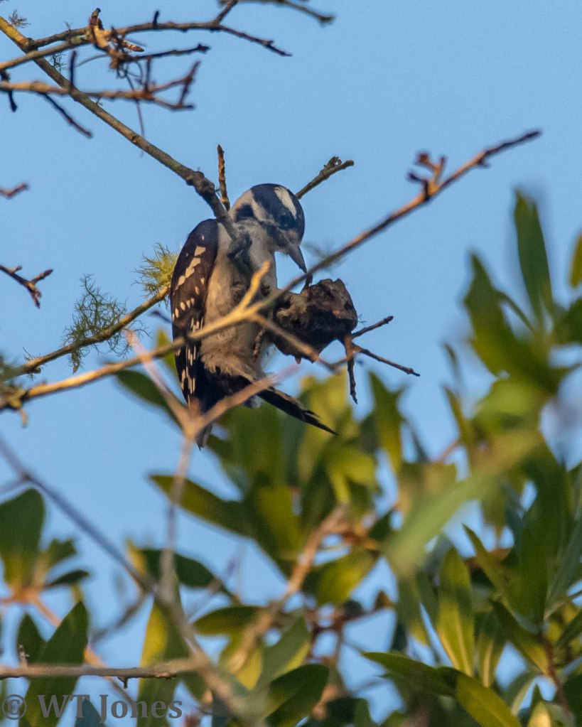 Small and almost non-stop in her search for food, a Downy Woodpecker examines what may be a tree gall.