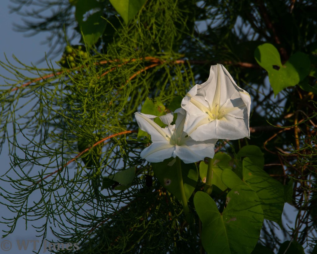 Some botanical references call these blooms Tropical White Morning-glory. I prefer the simpler (and, to me, more romantic) Moonflower. Call it what you will, Ipomoea alba is lovely. Go early. Sunlight causes them to wilt.