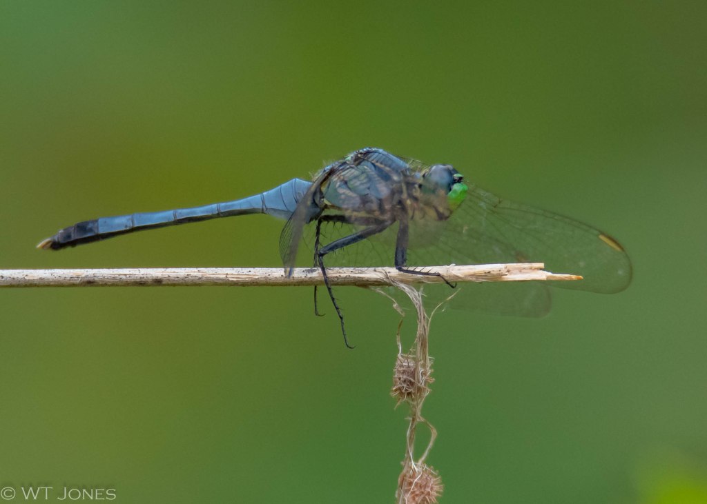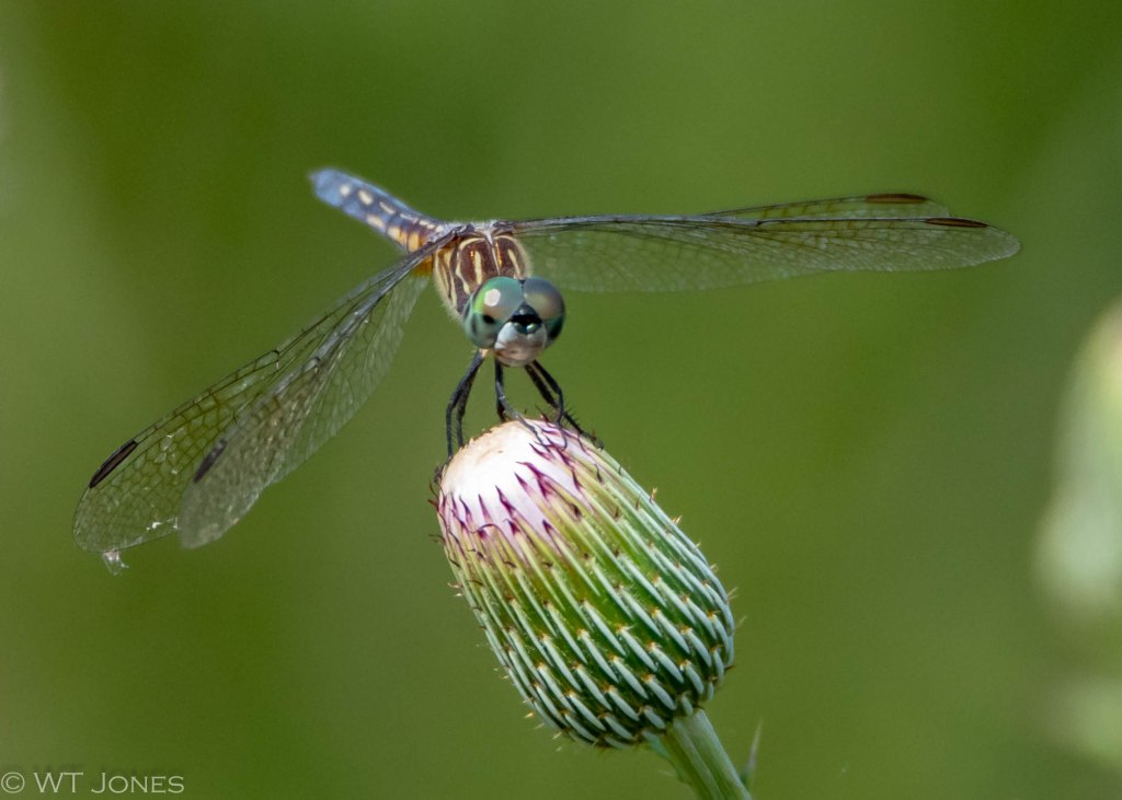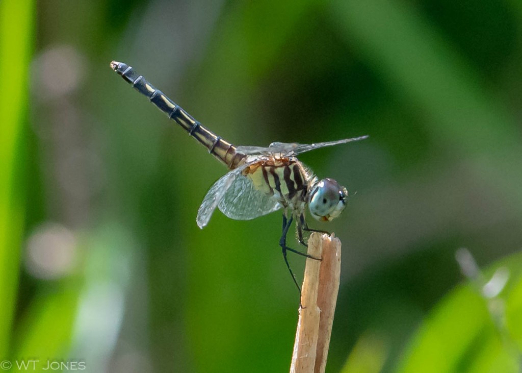 Small but colorful with blue eyes and yellow and brown racing-striped thorax, a Blue Dasher (Pachydiplax longipennis) brightens up the landscape.