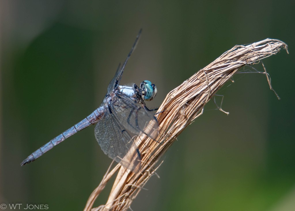 One of our local three dark-bodied skimmers, the Great Blue Skimmer (Libellula vibrans) can be distinguished by its bright blue eyes and white face. (The other two are Slaty and Bar-winged Skimmer.)