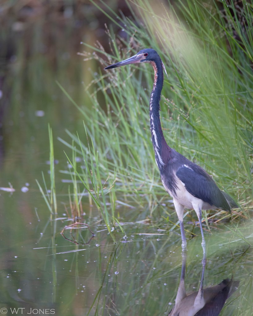 Blue, maroon, white. The aptly named Tricolored Heron concentrates its red eyes on the shallow water waiting for breakfast to swim into view.