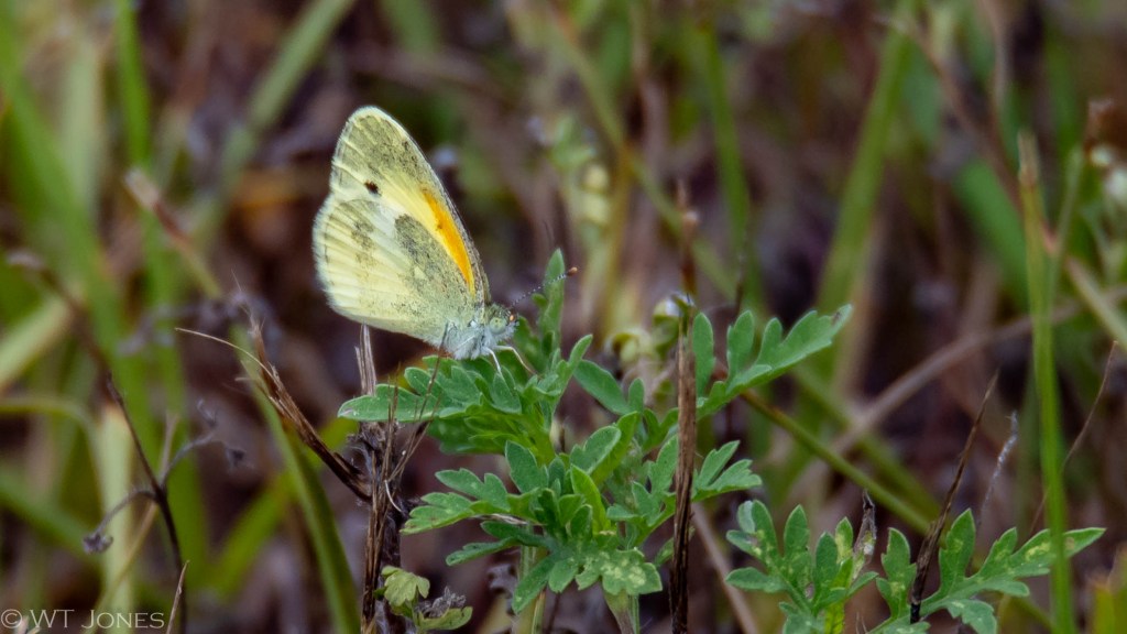 A group of butterflies known as Pierids (family Pieridae) include many white and yellow individuals. The small yellows and sulphurs rarely open their wings when perched and it’s a challenge to be able to observe their upper wings. Some believe the rich yellows of this group is what led to them being called “butter” flies. This very small individual is a Dainty Sulphur (Nathalis iole).