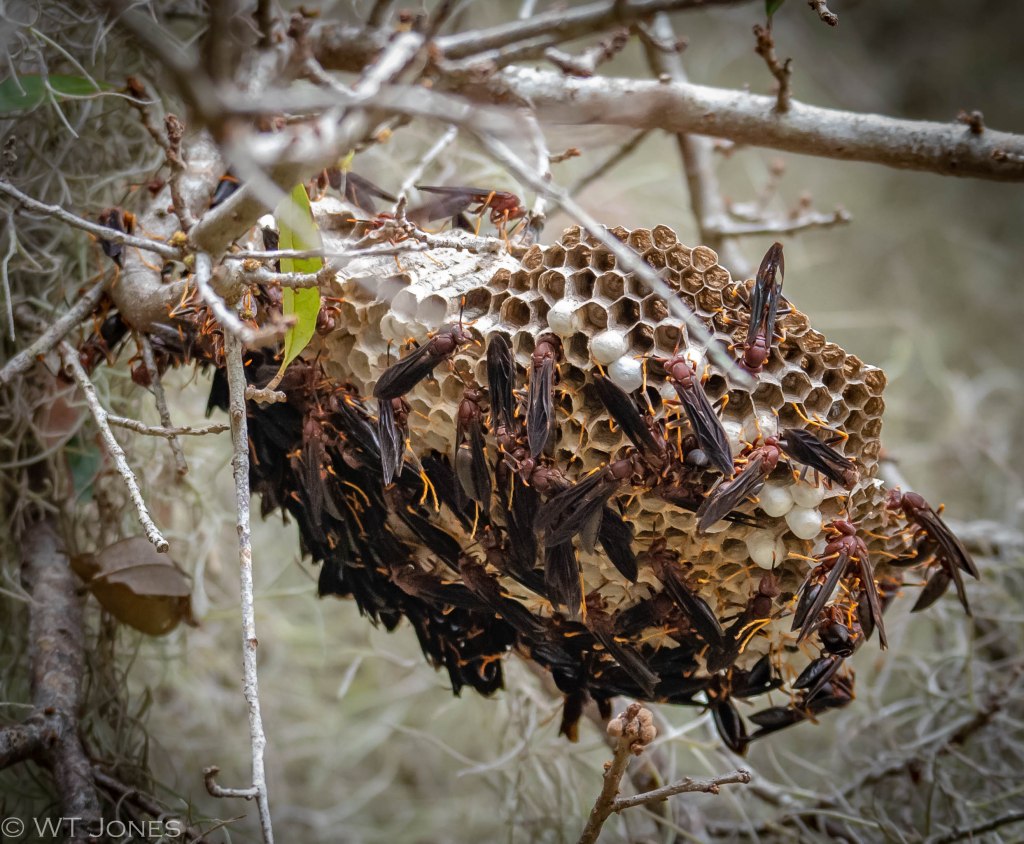 For me, more feared than toothy alligators are some of our large wasps. Painful memories! These are Ringed Paper Wasps (Polistes annularis).