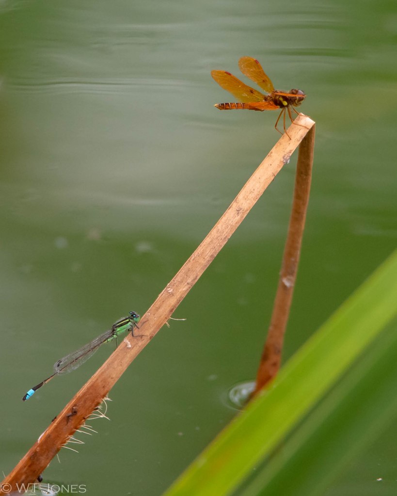 Once in awhile, my photographic motto (“Better Lucky Than Good”) actually works. Today I found an Eastern Amberwing (Perithemis tenera) and a Rambur’s Forktail (Ischnura ramburii) sharing the same reed.