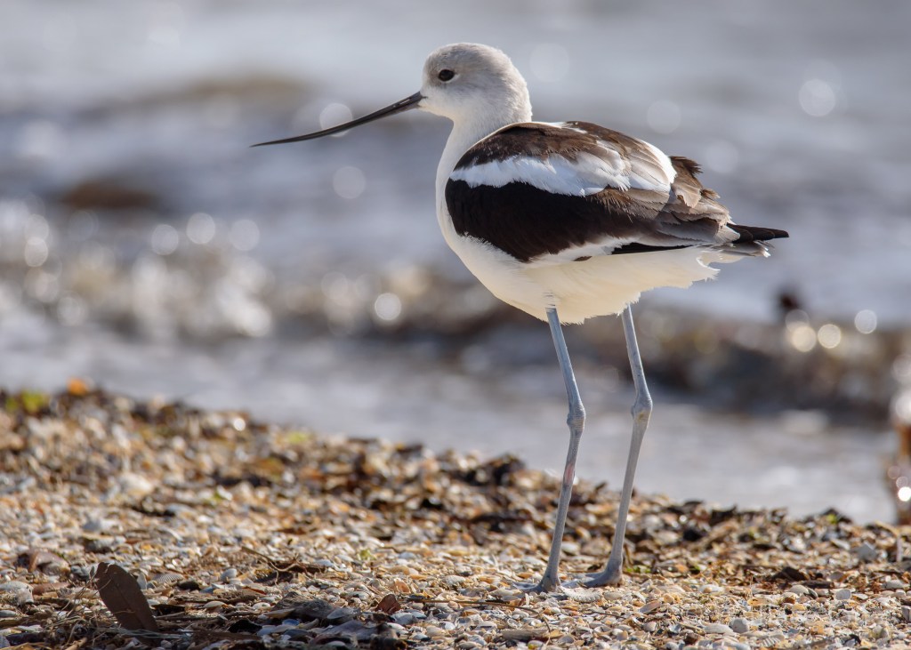An elegant American Avocet. No doubt this is a wading bird with those legs! Sometimes, one just has to stop and enjoy the view as she nestled among the shells and gazed at the incoming waves.