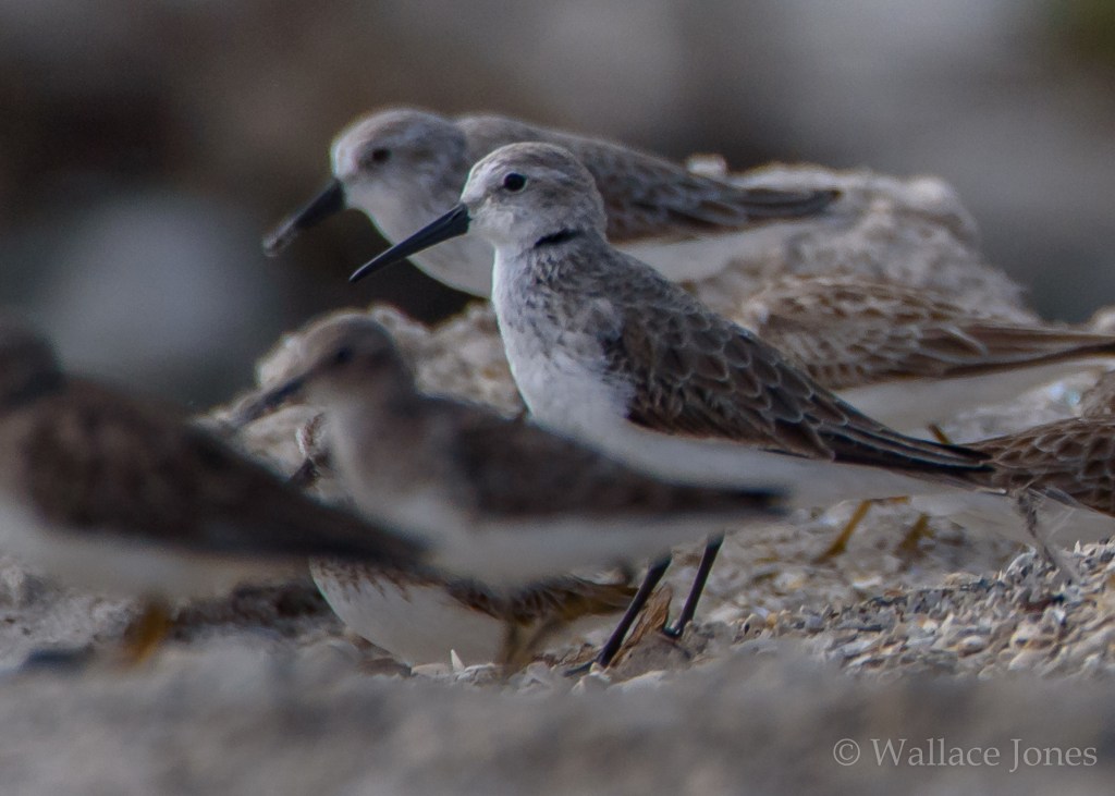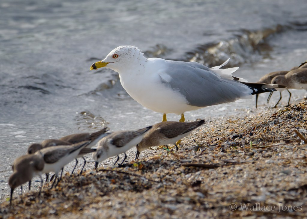 A Ring-billed Gull among Dunlins and Sanderlings gives an idea of their size difference.