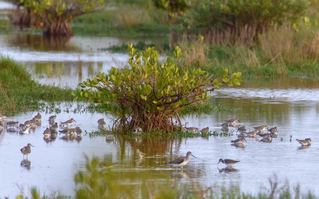 Vast shallow-water areas sprinkled with mangrove trees provide a perfect habitat for birds of all descriptions. A Great Egret soaks up the early morning sun’s rays as he prepares to look for crabs and fish all day.
