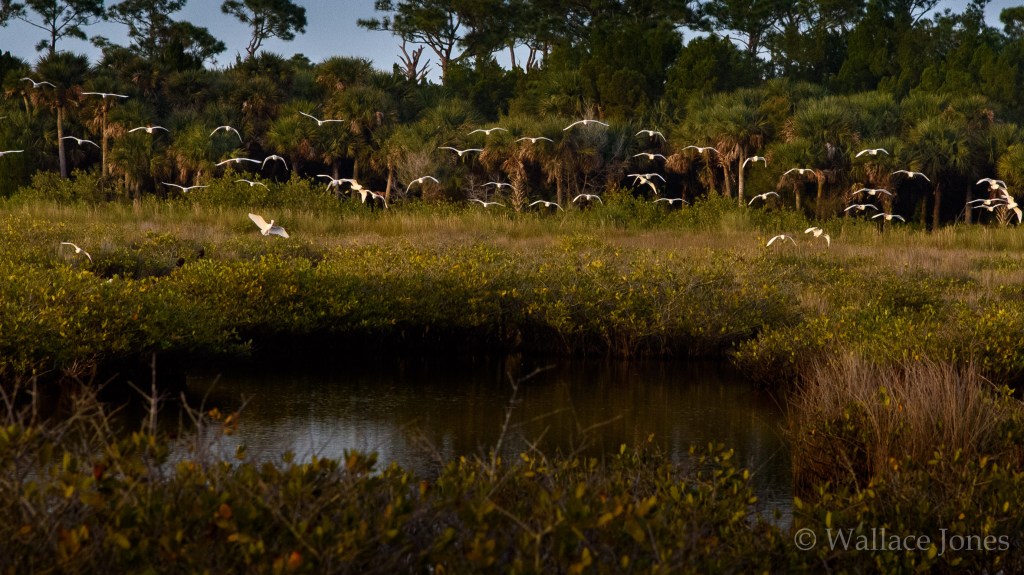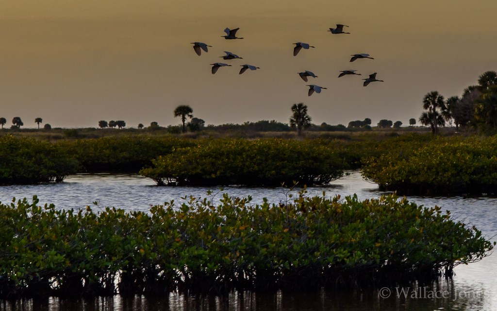 (Header Image: Egrets and Ibises head for their nightly roost.)