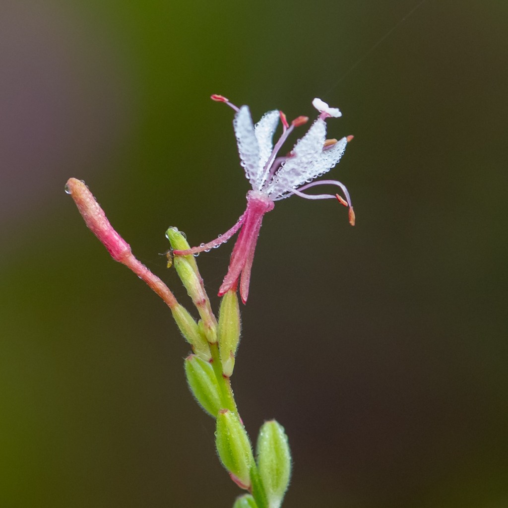Southern Beeblossom (Oenothera simulans) is one of those plants with small flowers which is all too easy to overlook once the blooming season is in full swing. If we stop to admire it, however, we can find a lot of beauty to like.