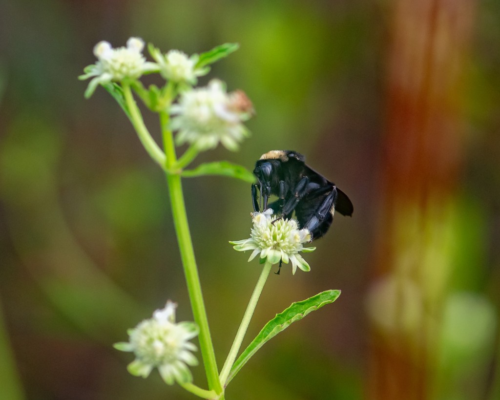 A unique critter. This is a solitary wasp which digs a tunnel where an insect is buried into which an egg is laid. When the baby wasp hatches, it has plenty to eat. Good thing, too, since Mama doesn’t do any parenting after the egg is laid. Great Golden Digger Wasp (Sphex ichneumoneus) on Mohr’s Thoroughwort (Eupatorium mohrii).
