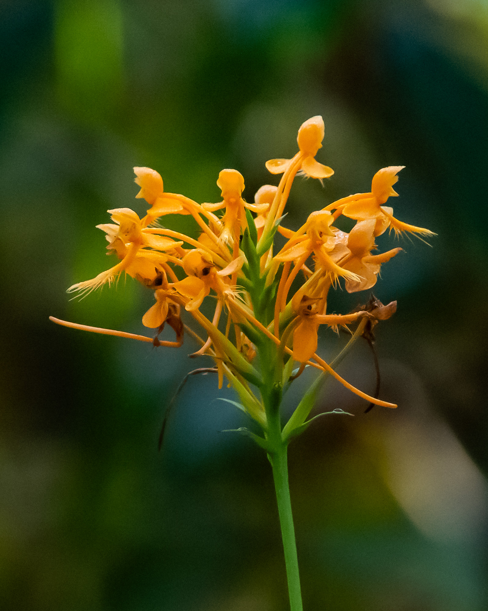 So, if it wasn’t a milkweed?? A first for us. As Gini was examining the bright orange blooms, her florist background kicked in. “This sure looks like some sort of orchid.” Spot on. Again. Yellow Fringed Orchid (Platanthera ciliaris) is also referred to in some sources as Orange Fringed Orchid. Not to be confused with Crested Yellow Orchid (P. cristata) or the Yellow Fringeless Orchid (P. integra). Not to mention, if you travel in the northern part of Florida, the very similar looking and rare Chapman’s Fringed Orchid (P. chapmanii). Coincidentally, Linda on her fabulous blog, Lagniappe, posted on August 21 about her find of the latter plant in Texas. Go there and see her wonderful write-up and photographs. (https://lindaleinen.com/2024/08/21/a-splendid-splash-of-orange/#comments)