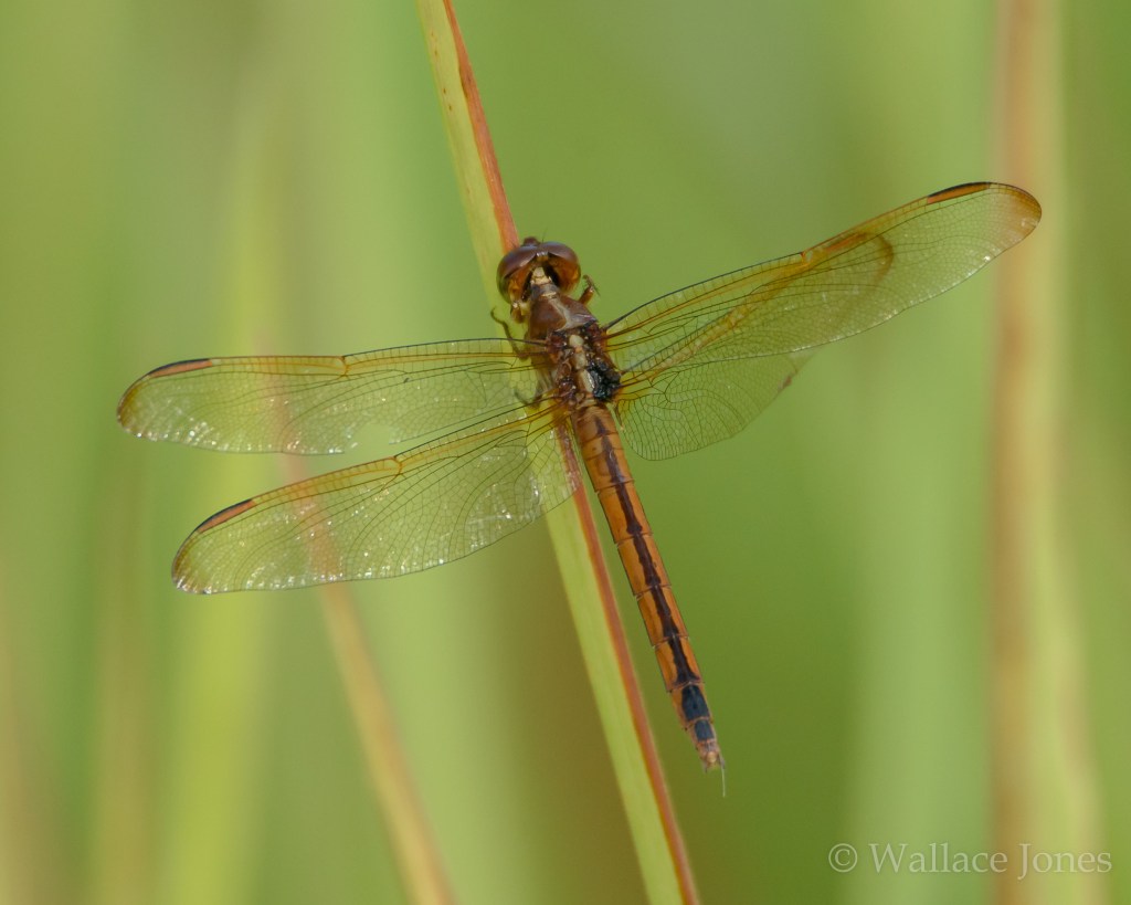 As dragonflies go, the Needham’s Skimmer (Libellula needhami) is medium-sized and the male is hard to miss with his reddish-orange body. The female pictured here has a warm brownish-orange abdomen and gold-tinted wings.