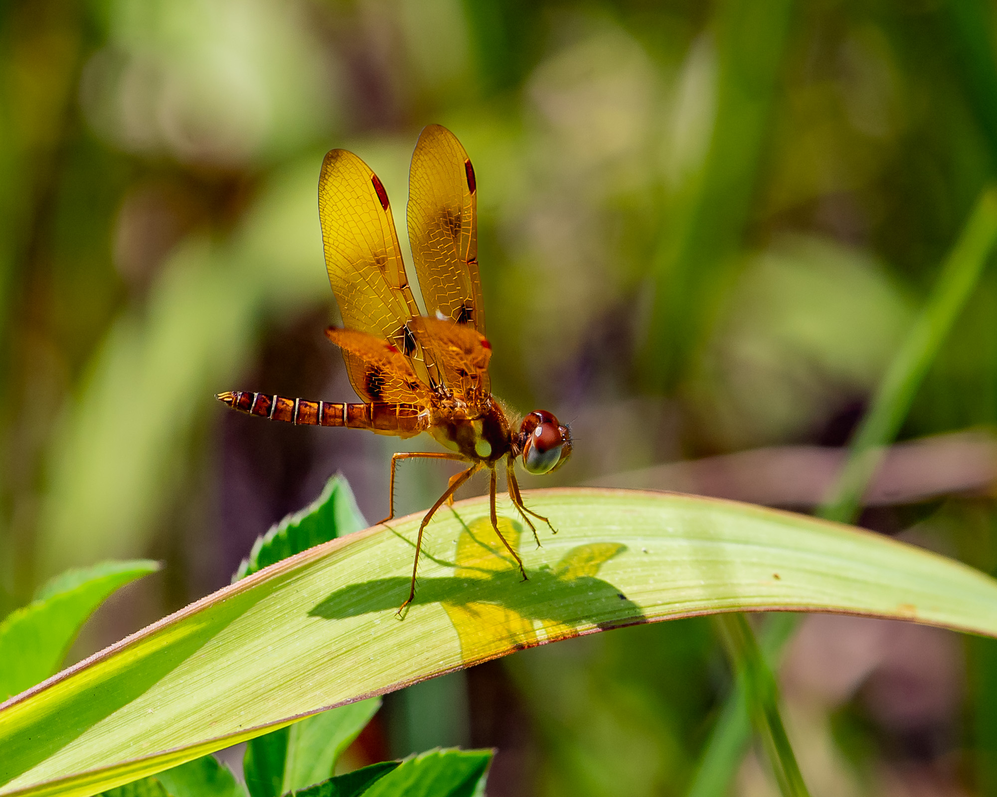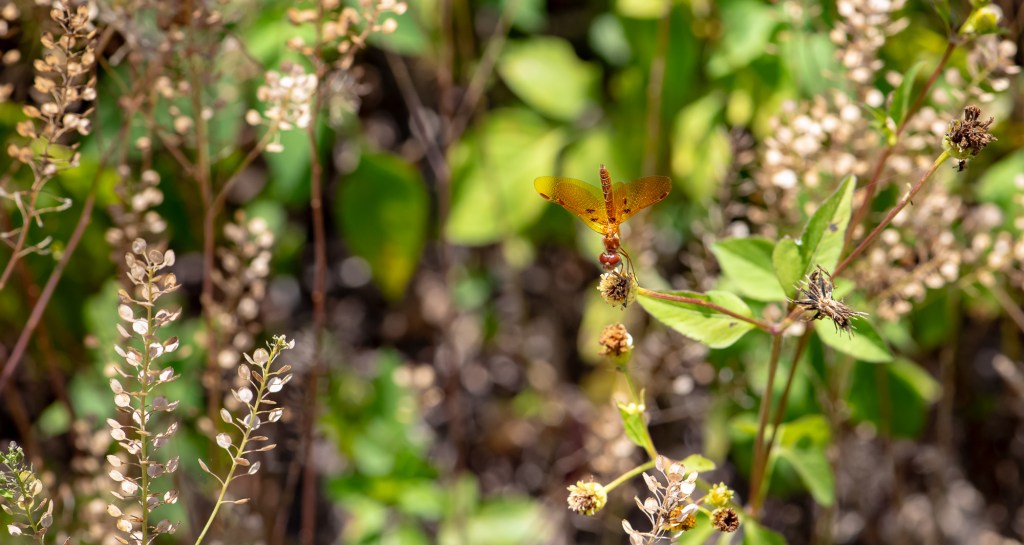 Gini’s description of the Eastern Amberwing was pretty accurate. They flew out to grab a small flying tidbit and returned to the same perch. The morning was warm and they often assumed an “obelisk” postion to help keep cool.
