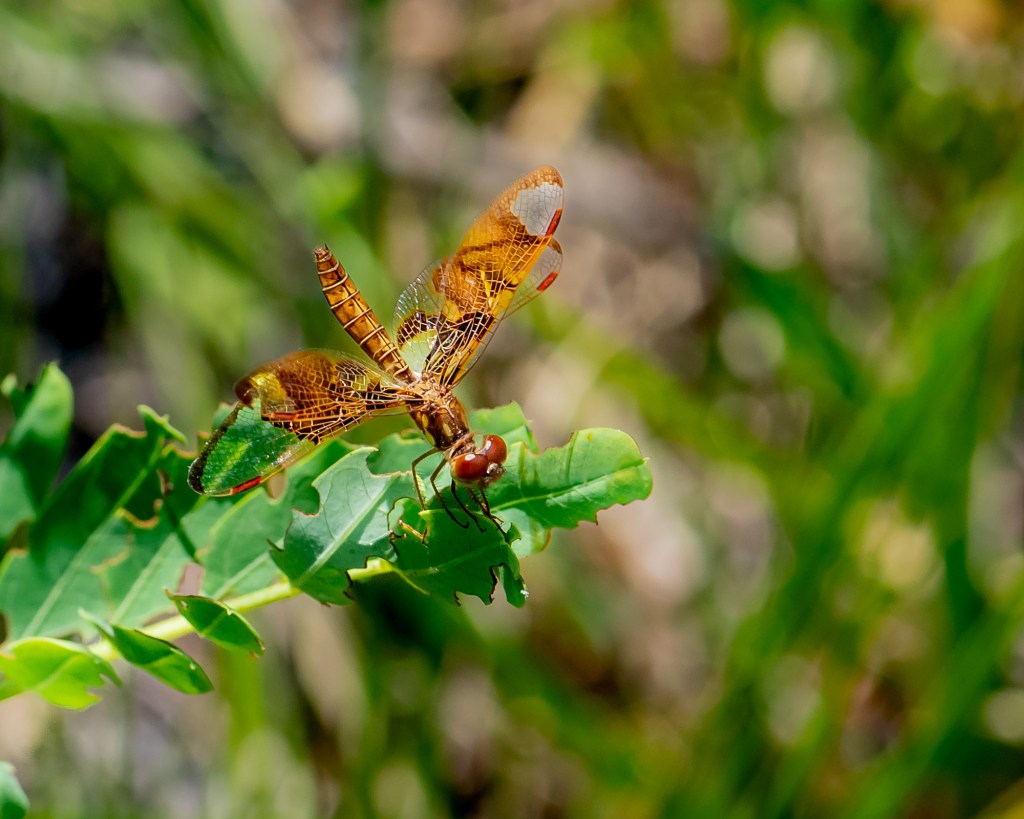 Tiny Eastern Amberwing (Perithemis tenera) dragonflies are among the smallest in North America. They often fly with legs dangling to imitate a wasp to lessen the chance of becoming a meal.