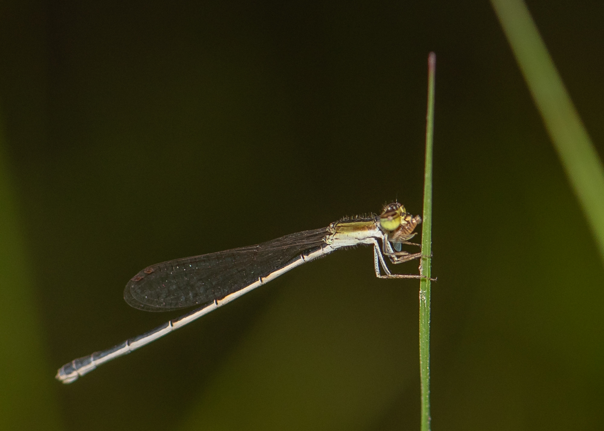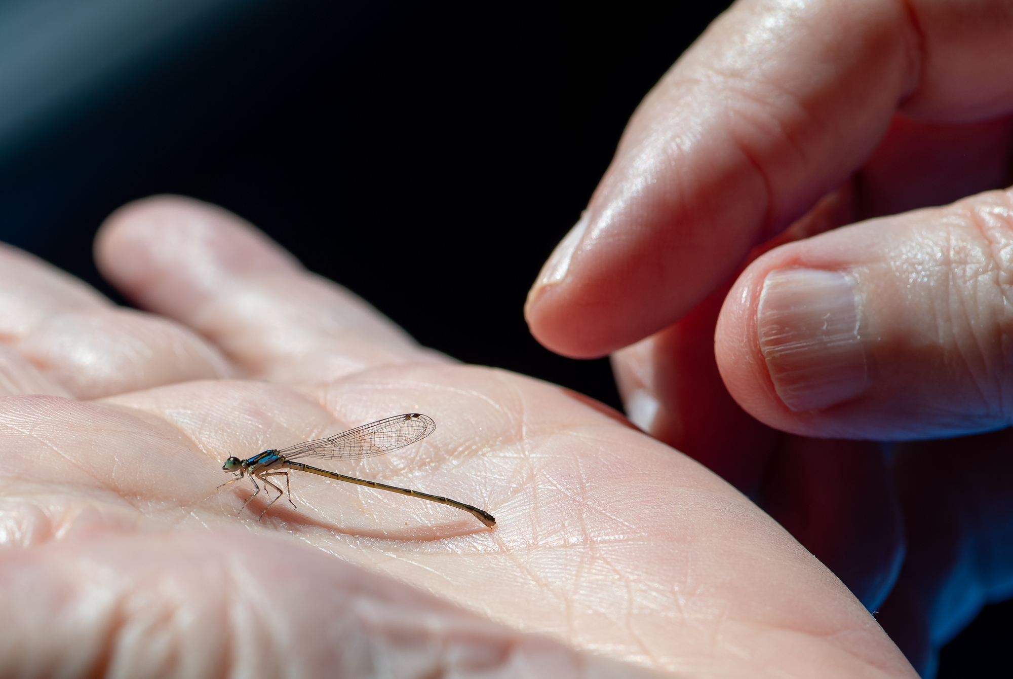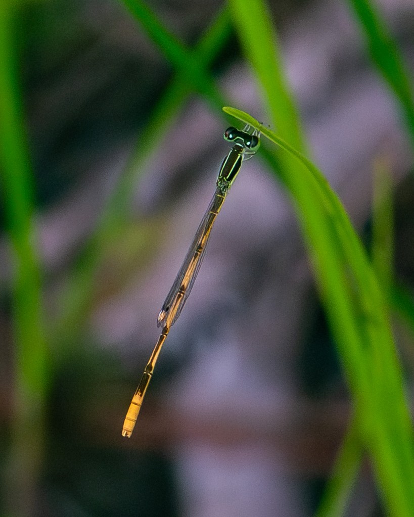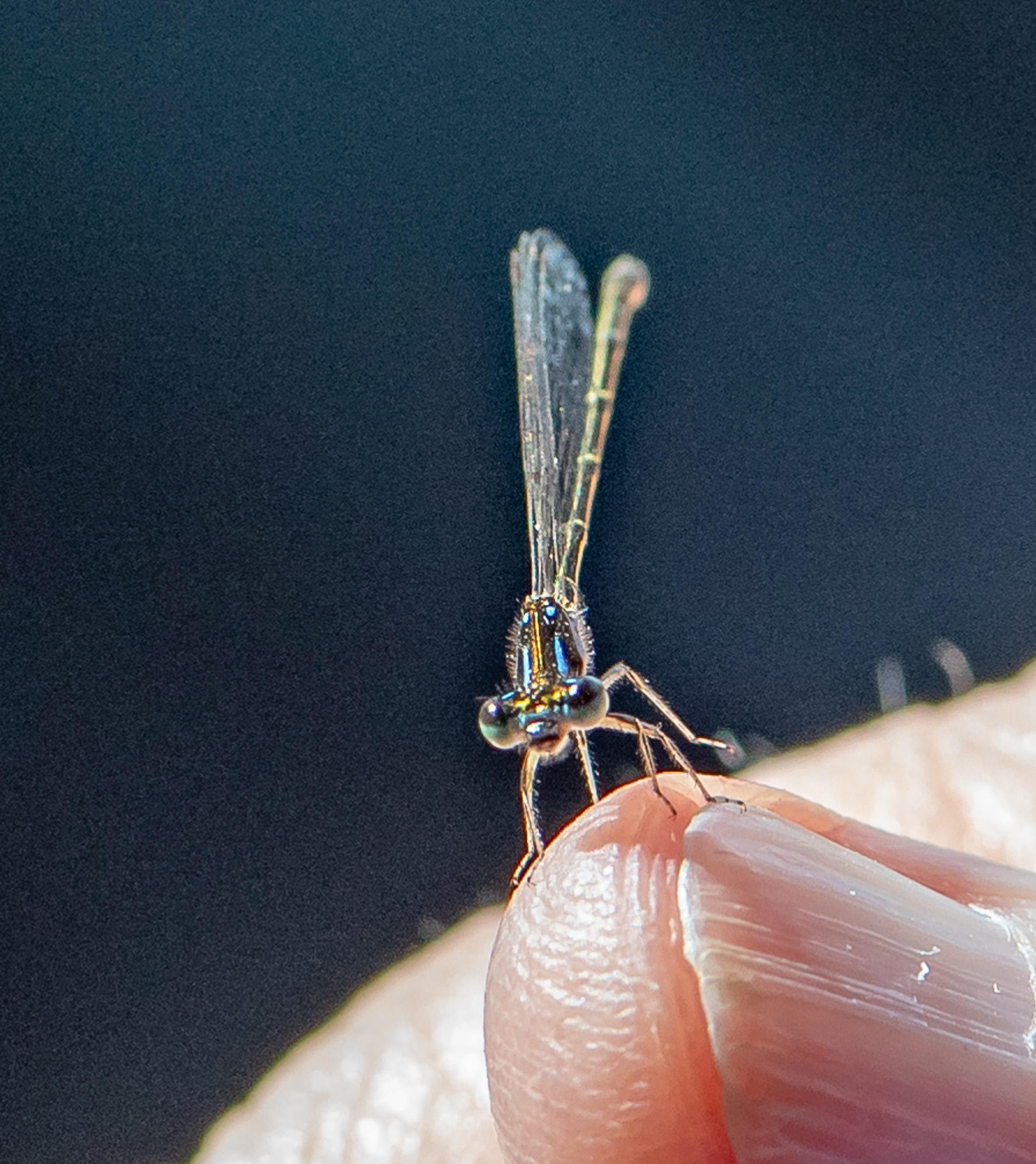 Typical. Walking the hedgerow hoping to encounter something different to photograph. Return to the car perspiring and reach for the water bottle. Gini, who remained in the cool shade to read says: “Don’t make any sudden moves or you’ll scare my friend.” Fragile Forktail (Ischnura posita). She Is — The Damsel Whisperer!