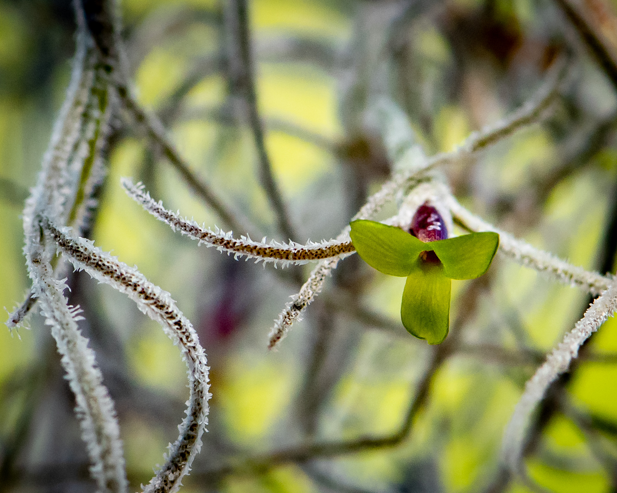 Both Gini and I are native Floridians. As such, we literally grew up with Spanish Moss (Tillandsia usneoides). We used it as a mattress, cleaned the stuff from oak trees, learned about the redbugs which inhabit the masses and caused us to itch miserably, enjoyed its scenic beauty hanging from a cypress tree along a lakeshore. But neither of us could recall ever knowing the ubiquitous gray curtain of our youth had flowers.