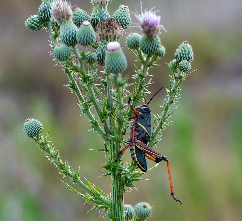 Eastern Lubber Grasshopper (Romalea microptera) on Nuttall’s Thistle (Cirsium nuttallii). This is likely a second or third “instar” and in a few weeks will turn bright yellow and orange as it becomes an adult.