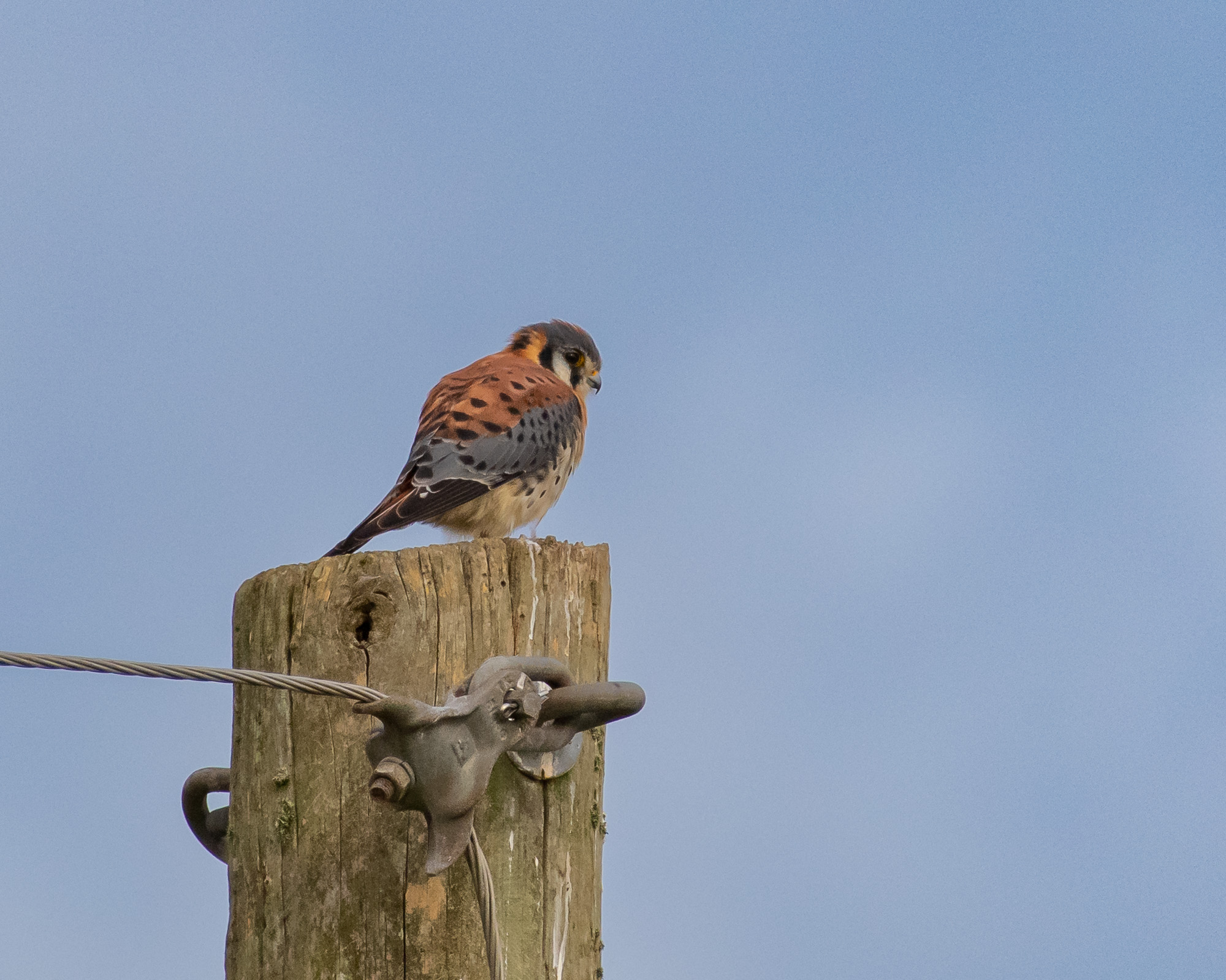 North America’s smallest falcon is the American Kestrel. This colorful male simply doesn’t care that the utility pole does not make a photogenic perch. He only cares that from up there he can spot a grasshopper hiccup at a hundred yards.